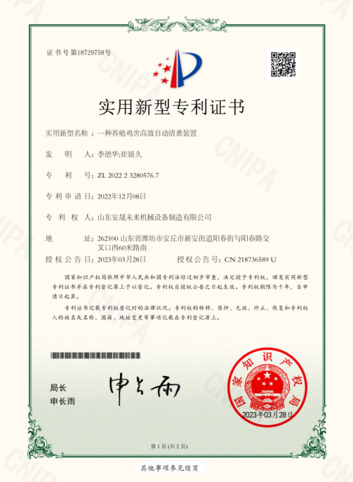 養(yǎng)殖雞舍高效自動(dòng)清糞裝置證書(shū)